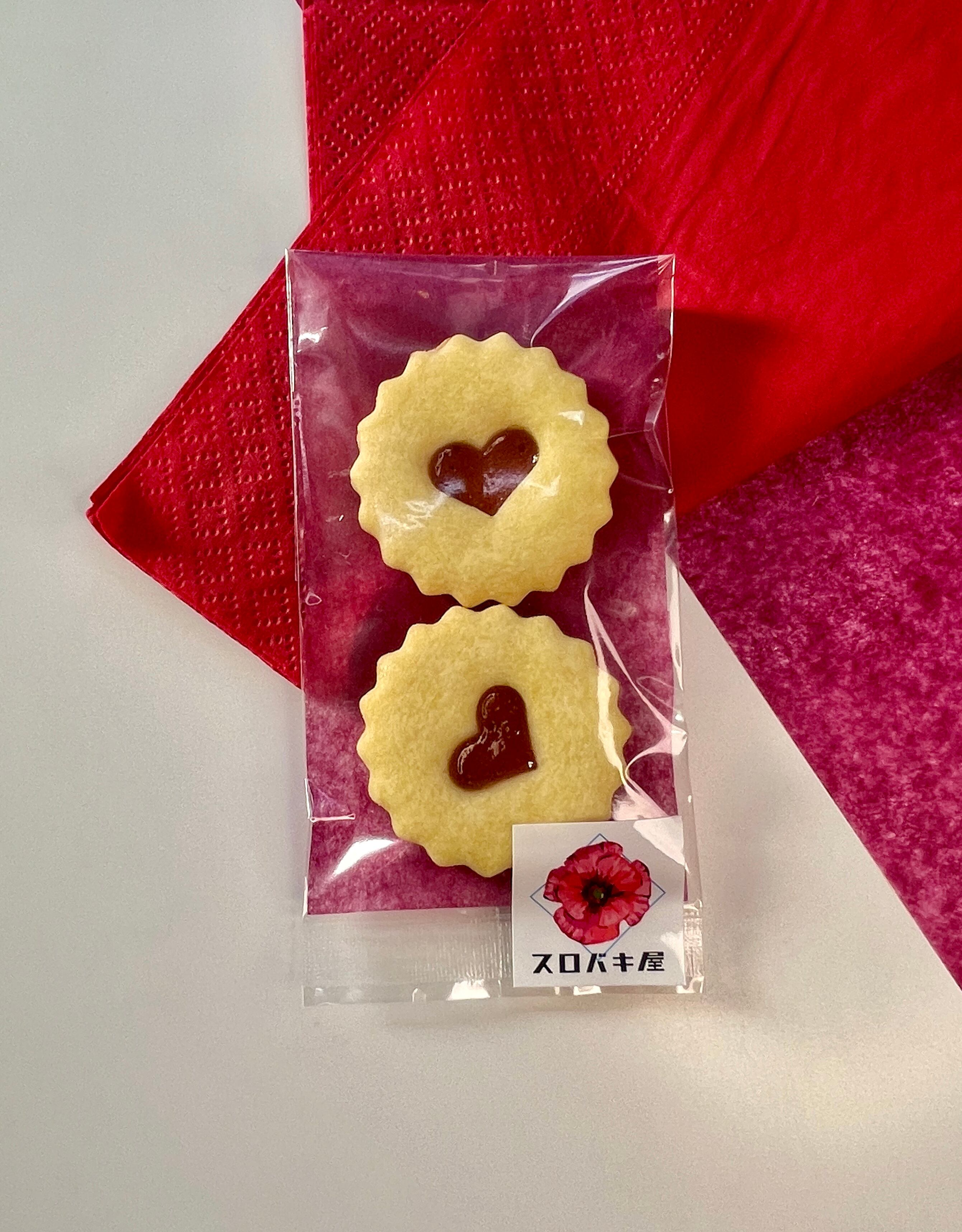 【リンサークッキー(ハート)】小麦粉(国産)、バター、砂糖、卵の黄身、苺ジャム